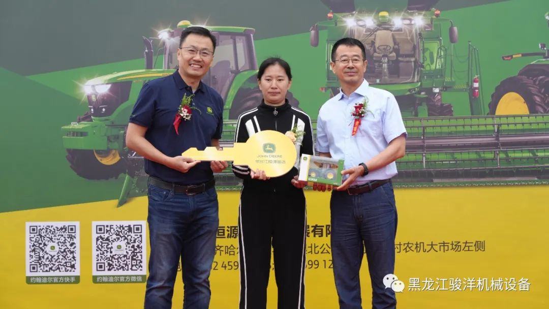 隨后,約翰迪爾領(lǐng)導(dǎo)層為黑龍江恒源迪農(nóng)業(yè)開業(yè)剪彩并向用戶交付了8600青貯機(jī)、S760收割機(jī)和6M-2104拖拉機(jī)金鑰匙。